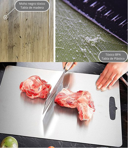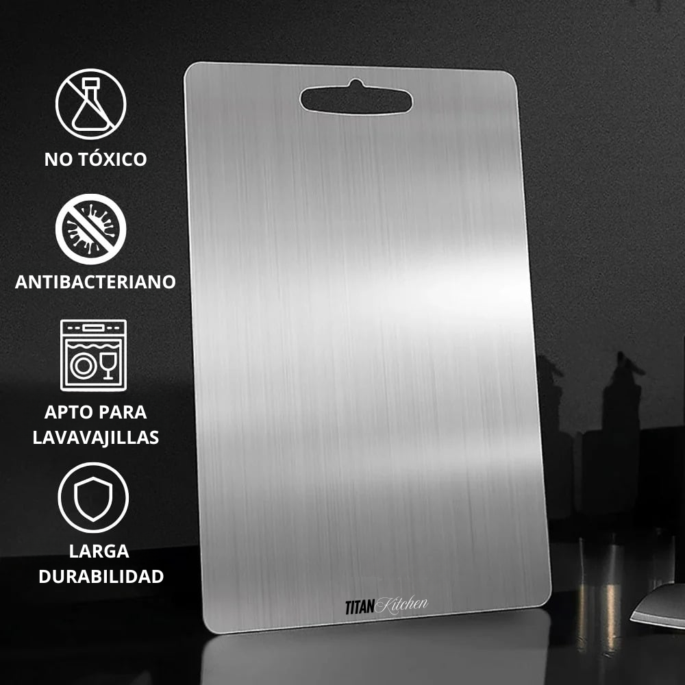 TitanKithcen™ es la revolución que tu cocina necesitaba. Fabricada en titanio de grado alimenticio, esta tabla de cortar no solo ofrece una durabilidad incomparable, sino que también protege tu salud. A diferencia de las tablas de plástico, que liberan microplásticos invisibles, o las de madera, que retienen bacterias en sus grietas, TitanKitchen™ mantiene una superficie segura, limpia y resistente al desgaste. Disfruta de preparar tus alimentos con la tranquilidad de saber que cada corte es puro, higiénico y preciso.